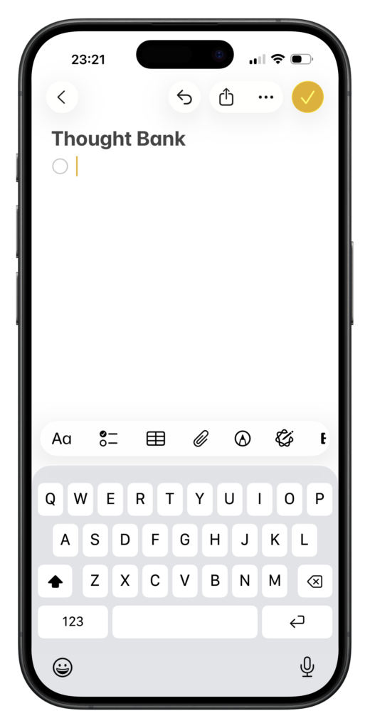 So when I have an outcome, I open the Notes App and in a few words, quickly type keywords so when I re-read it, I’ll remember what I meant by it. Then I just put my phone away again. I’ve named it my “Thought Bank”. My place for anything that just pops up, which I can quickly capture and move on without having the ‘stress’ of forgetting it.